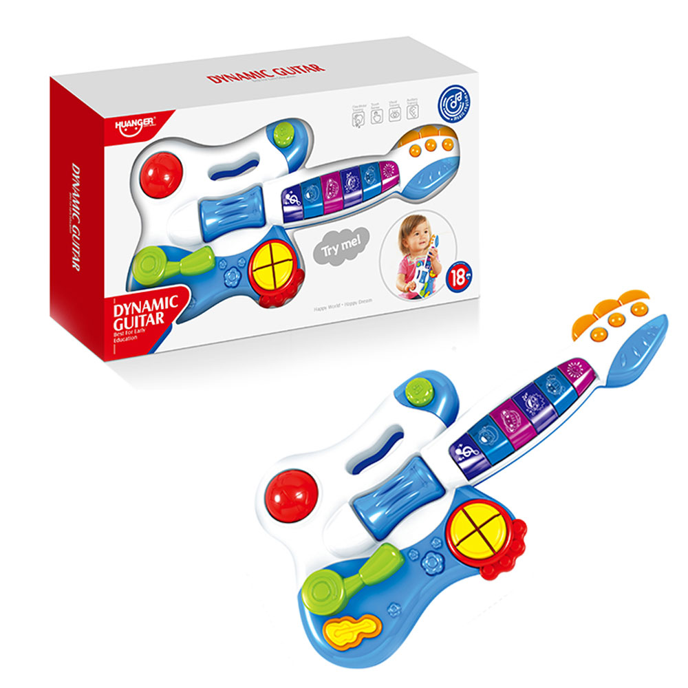 Muzički instrument u plavoj namenjen deci predškolskog uzrasta sa podesivom jačinom zvuka i različitim muzičkim melodijama. Može podstaći muzičko interesovanje kod dece i osećaj za ritam. Gitara je u različitim bojama, sadrži puno oblika i mogućnosti za manipulativne aktivnosti. Razvija čulo sluha, čulo dodira, vizuelnu percepciju i finu motoriku.