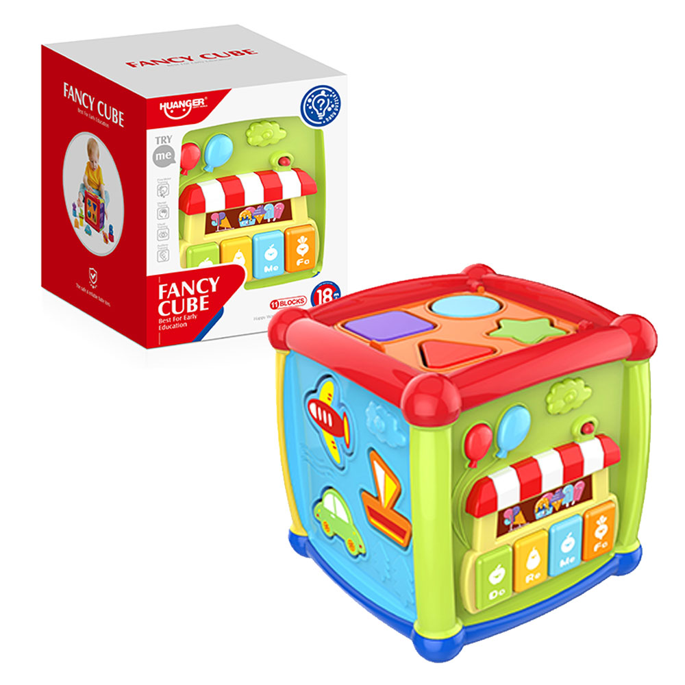 Muzička kocka sadrži 5 različitih igara: 3 igre sa umetaljkama (tema: prevozna sredstva, slova i geometrijski oblici), muzička igra sa dugmadima na kojima su označene note (do, re, mi, fa), sat sa brojevima i zubčanici. Pritiskom određenih tastera/dugmadi stvara se melodija koju prate šarena svetla. Kocka je dodato ukrašena ilustracijama. Svi lementi su glatkih ivica sa jakom otpornošću na udar. Svetlosni elementi dodatno doprinose atraktivnosti Igračke koja pre svega ima edukativnu ulogu i poboljšava vizuelno-motoričke koordinacije pokreta. Dimenzije pakovanja: 15.8*15.8*19cm, dimenzije proizvoda: 15.5*15.5*15.5cm, uzrast: 18+ meseci